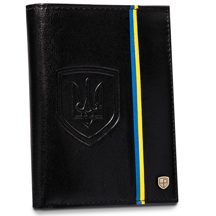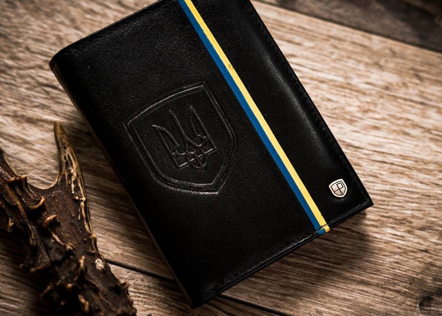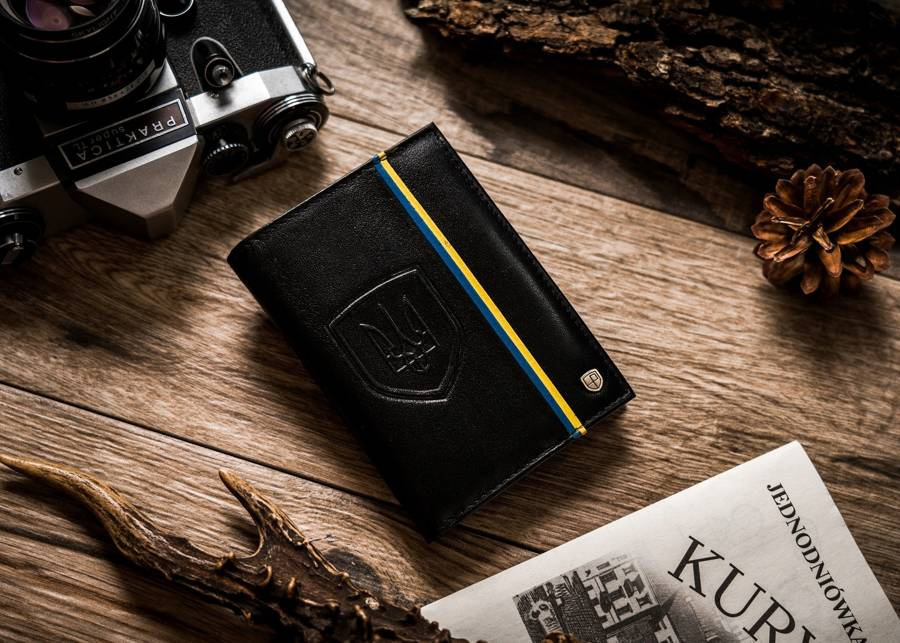 - Flaga i godło Ukrainy | Portfel o klasycznej stylistyce. Model w orientacji pionowej bez zapięcia zewnętrznego. Na froncie mieści się delikatny motyw niebiesko-żółtej flagi oraz wizerunek godła Ukrainy
