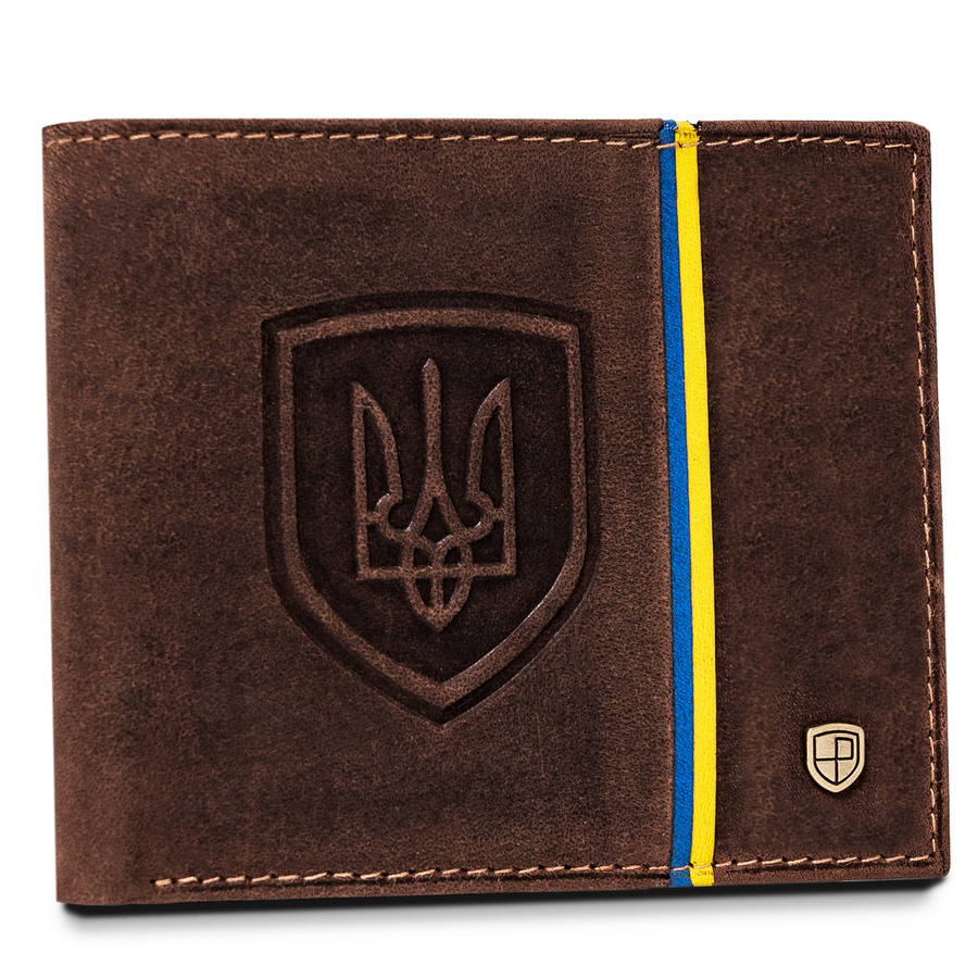 - Patriotyczny motyw | Portfel o klasycznej stylistyce. Model w orientacji poziomej bez zapięcia zewnętrznego. Na froncie mieści się delikatny motyw niebiesko-żółtej flagi oraz wizerunek godła Ukrainy