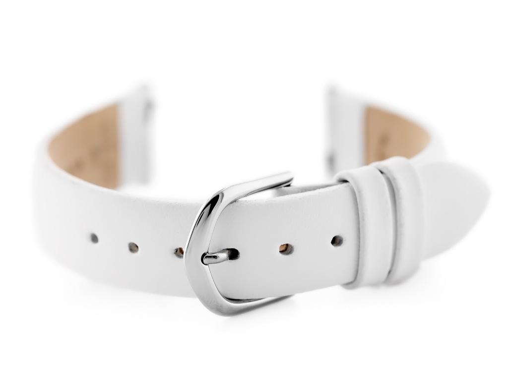 Pasek ze skóry naturalnej w kolorze białym. Klamerka ze stali szlachetnej w kolorze srebrnym.