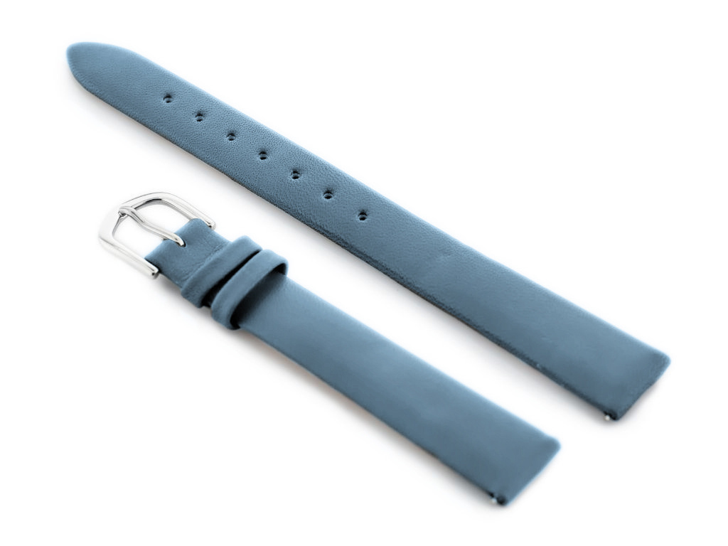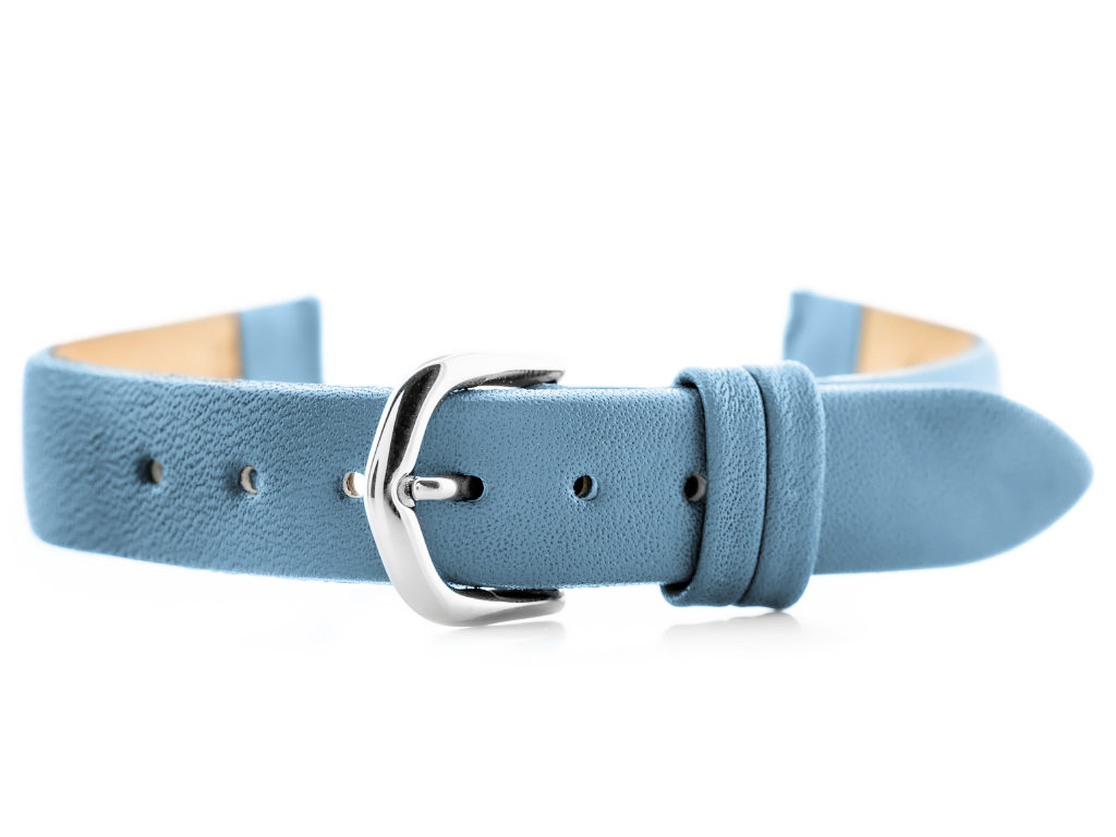 Pasek ze skóry naturalnej w kolorze jasnoniebieskim. Klamerka ze stali szlachetnej w kolorze srebrnym.