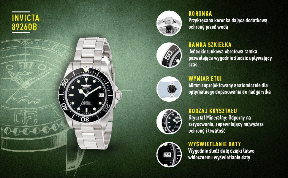 INVICTA 8926OB to klasyczny nurek z wodoszczelnością do 200m, z automatycznym mechanizmem SEIKO NH35A,