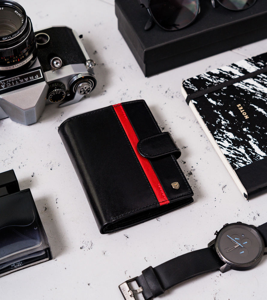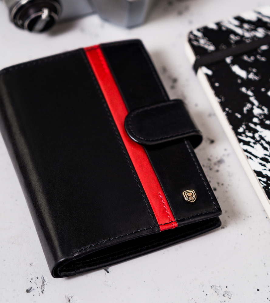 - Ponadczasowy wygląd | Czarny kolor to klasyka, a portfel w tym kolorze daje poczucie komfortu i świadomość, że możesz poczuć się modnie. Front portfela zdobi elegancki czerwony pasek.
