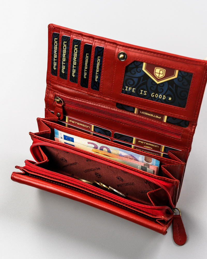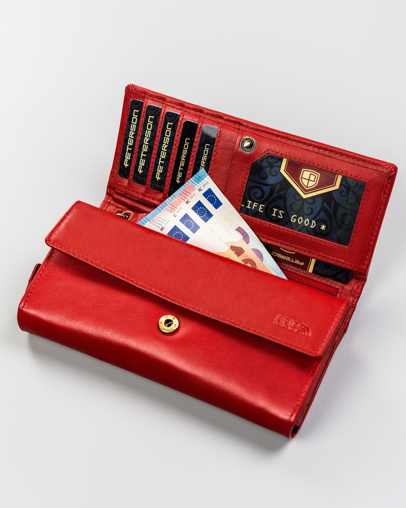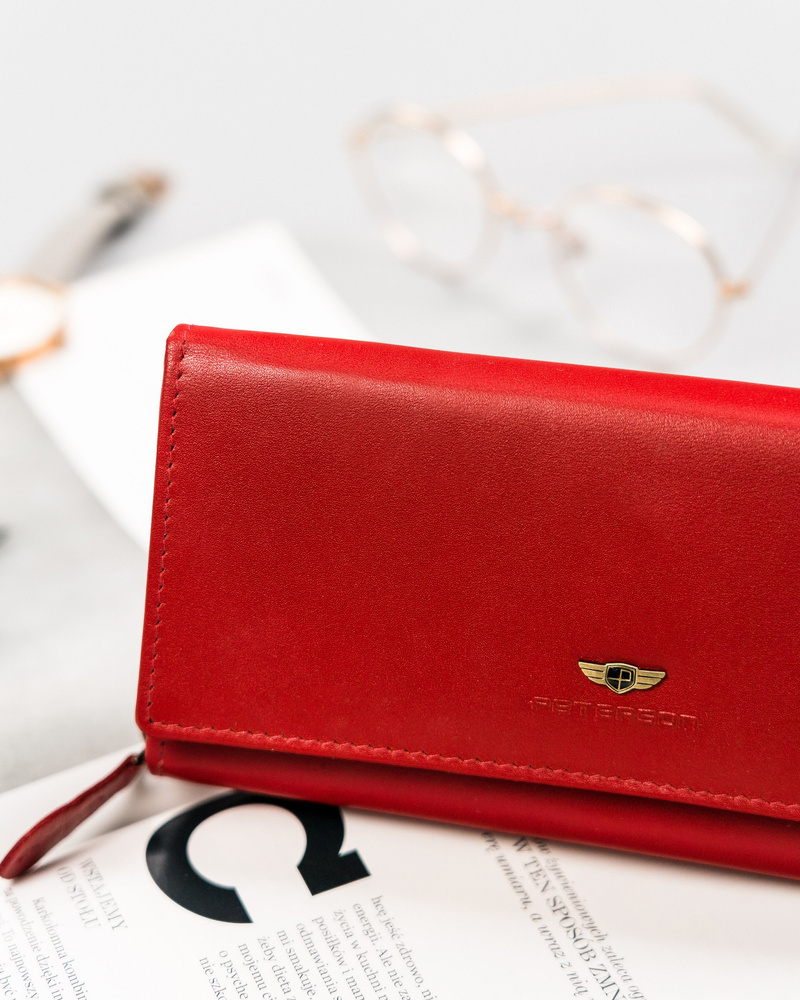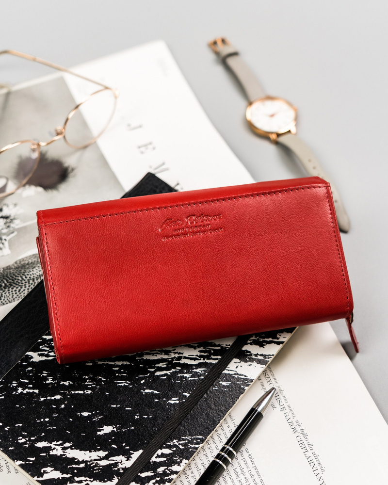 - Ponadczasowa, klasyczna czerwień | Prosty, klasyczny design i wysoki poziom funkcjonalności. Model w orientacji poziomej zapinany na zatrzask. Front portfela zdobi oryginalne logo marki.