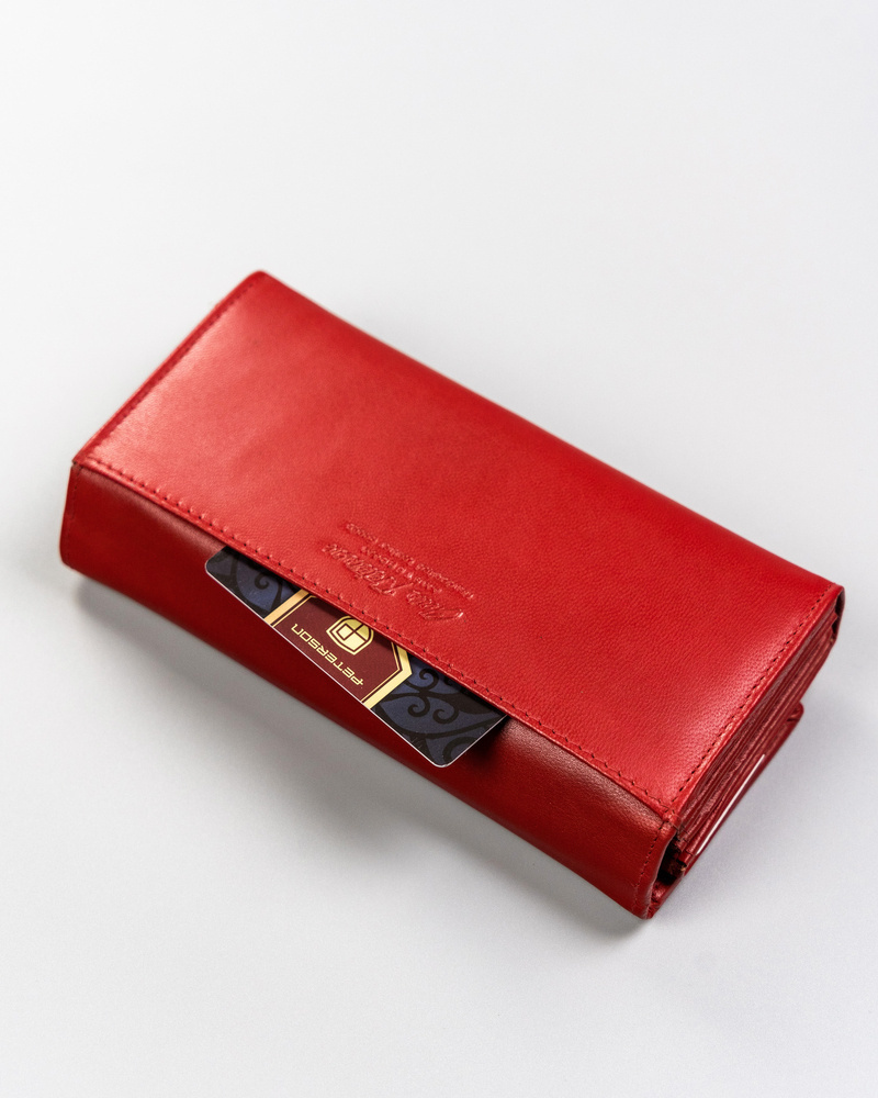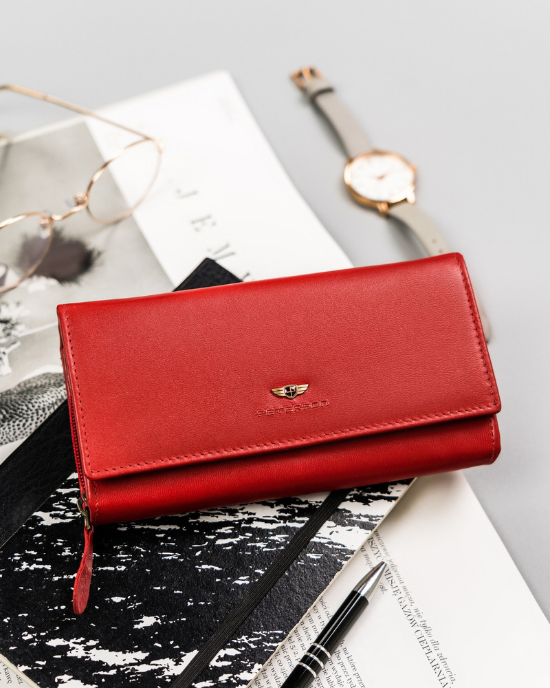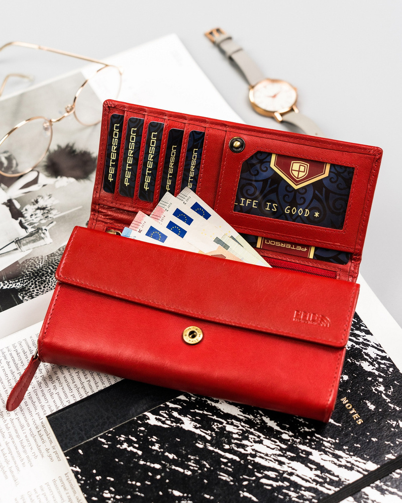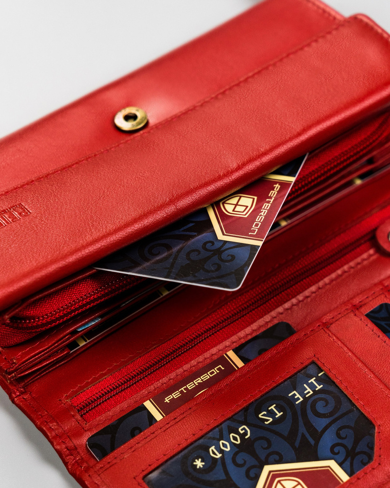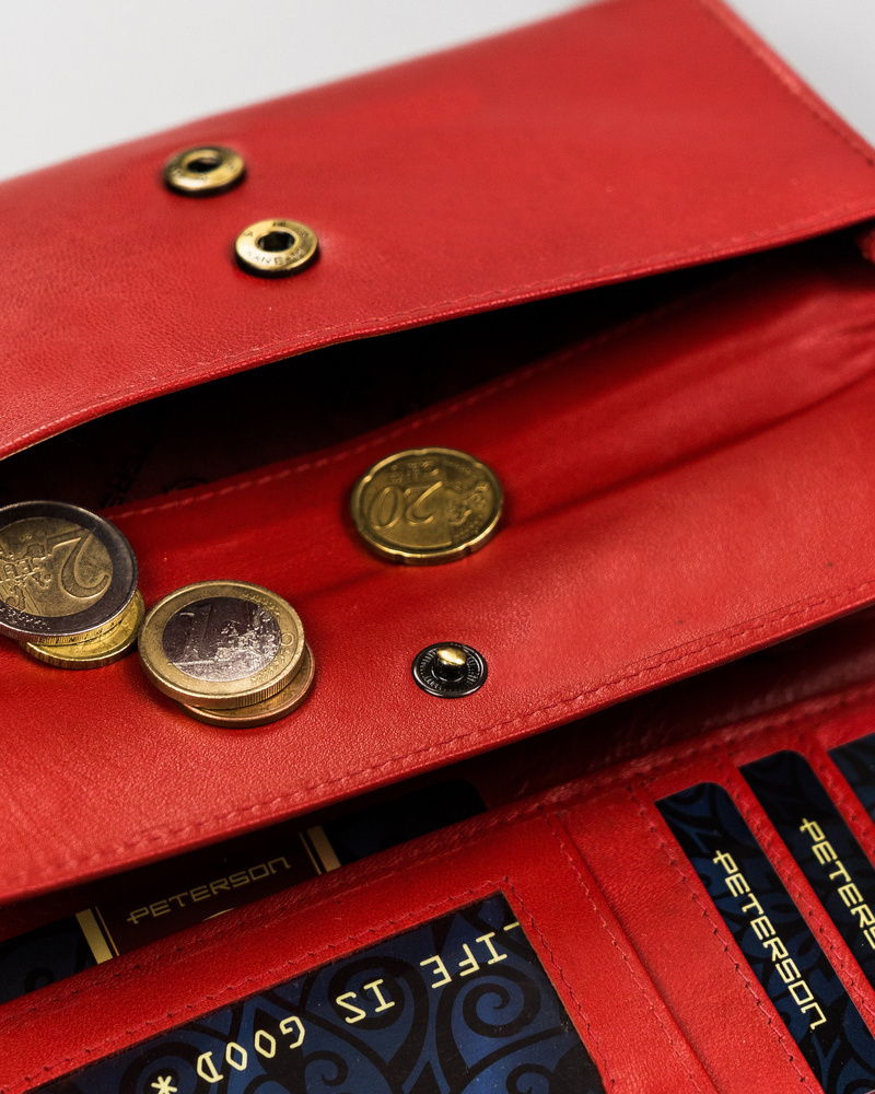 - Ponadczasowa, klasyczna czerwień | Prosty, klasyczny design i wysoki poziom funkcjonalności. Model w orientacji poziomej zapinany na zatrzask. Front portfela zdobi oryginalne logo marki.