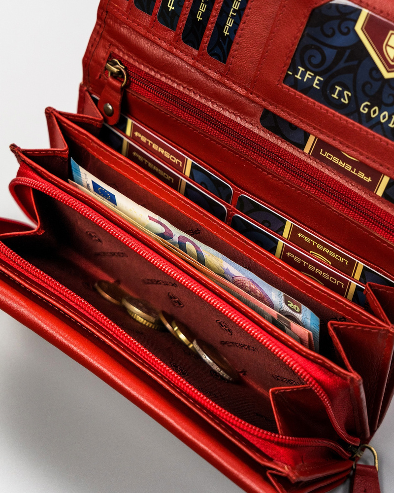 - 1 przegrodę w centralnej części portfela, zamykaną na suwak.