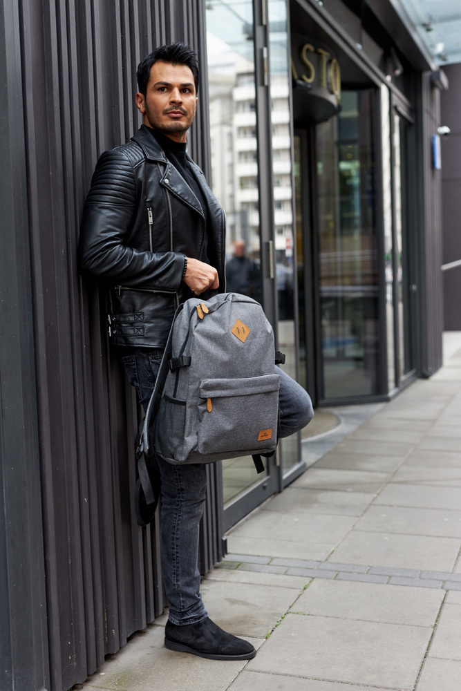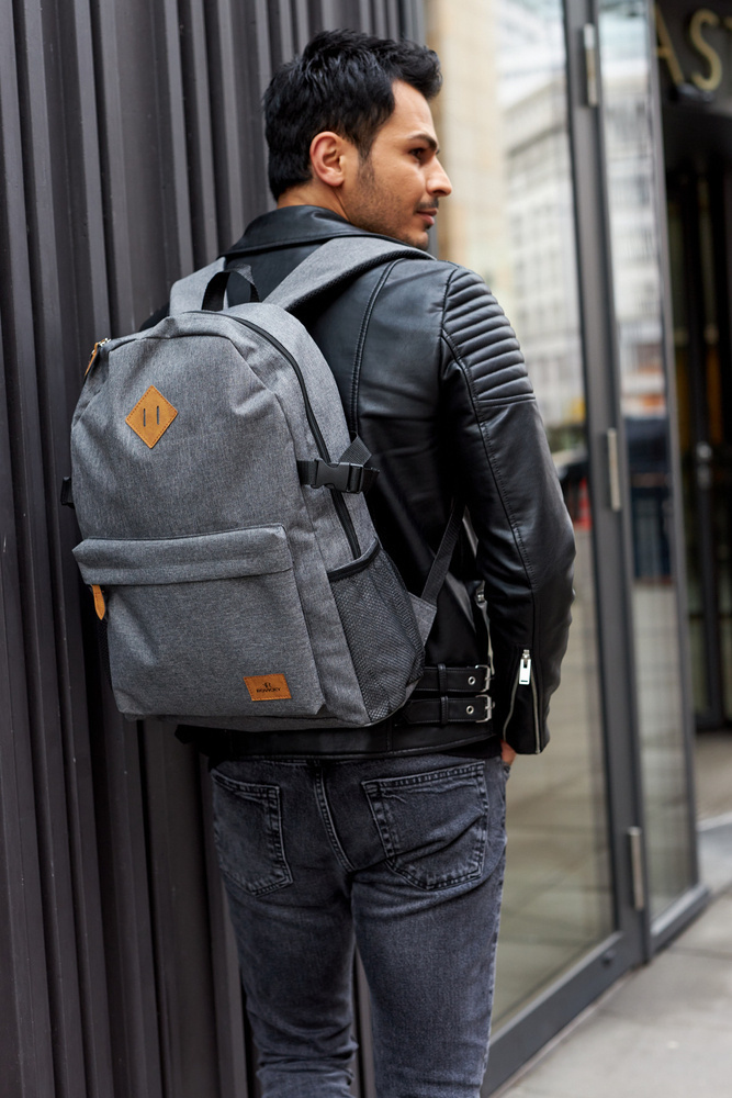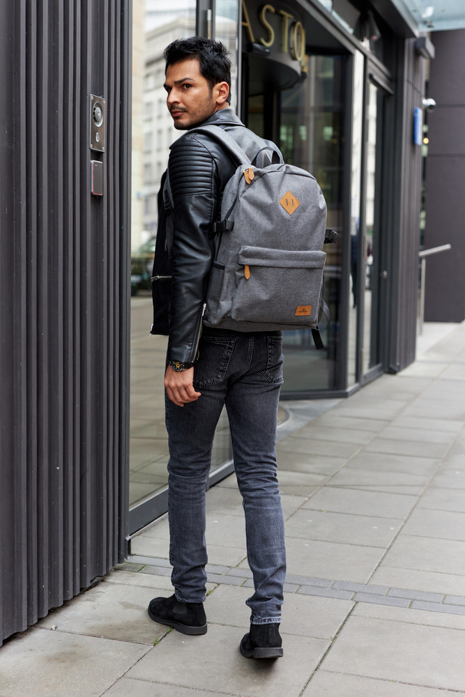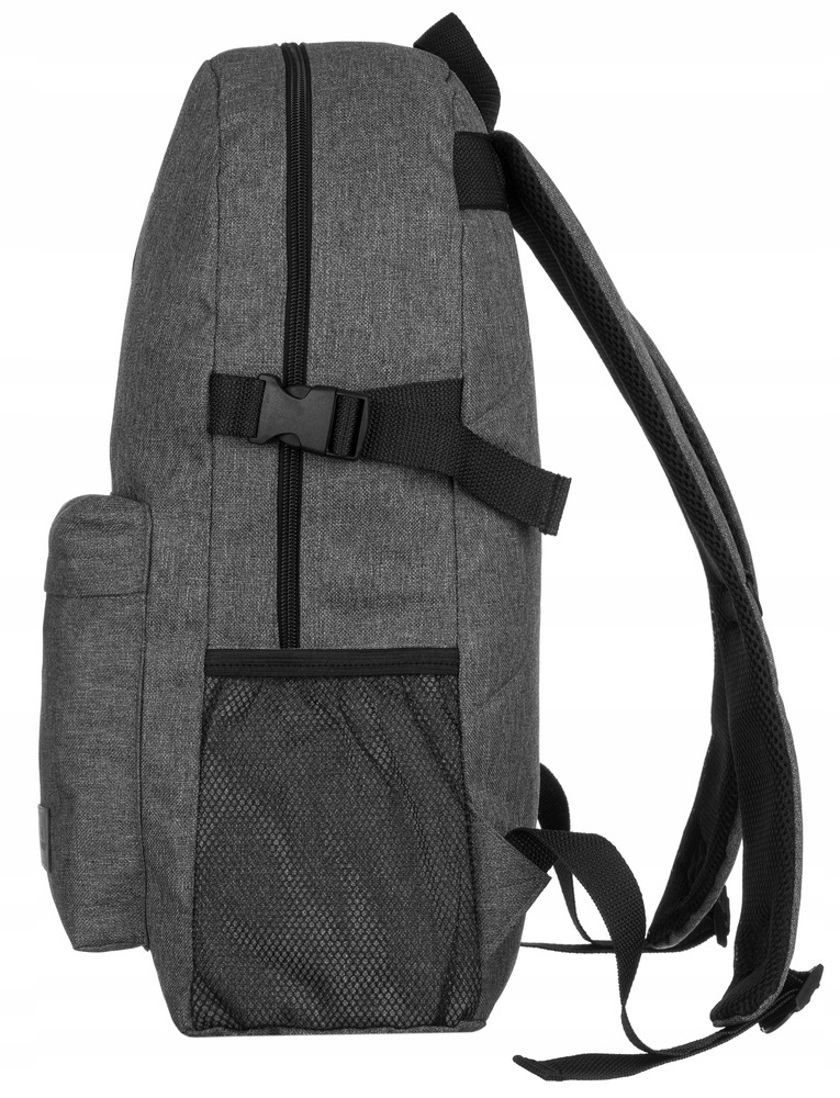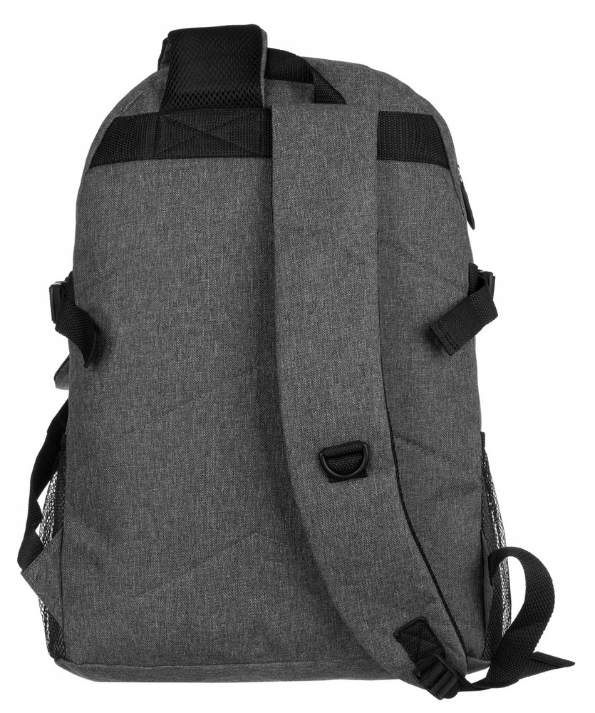 Prezentowany plecak został wykonany bardzo trwale z wysokiej jakości poliestru. Zawieszony na solidnych szelkach z regulacją. Posiada uchwyt na dłoń, który będzie przydatny np. w komunikacji miejskiej. Wszystkie jego metalowe elementy mają czarny kolor.