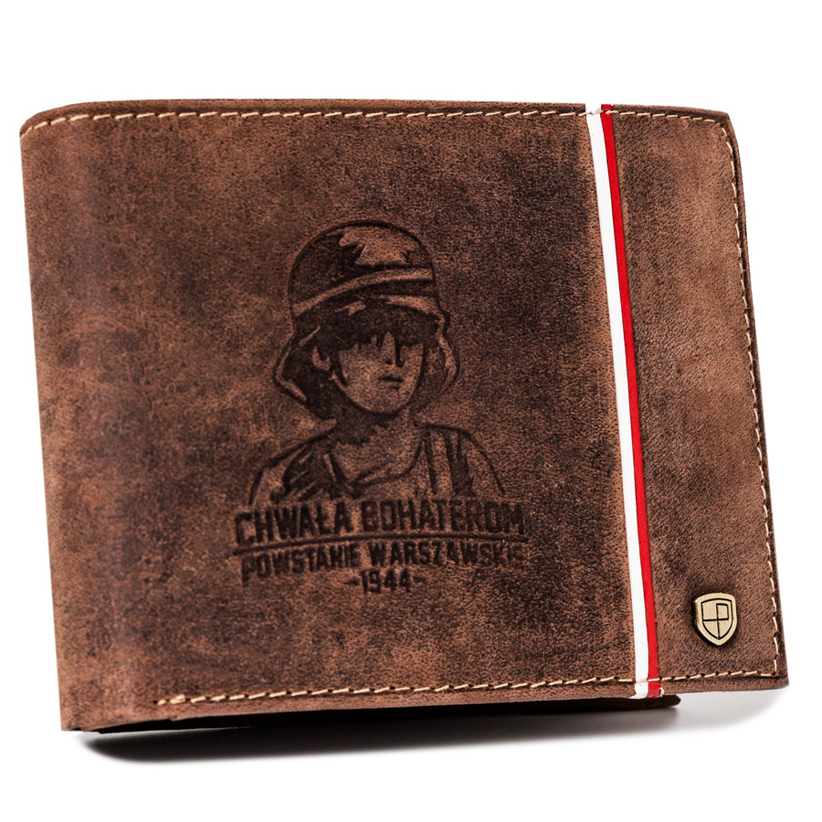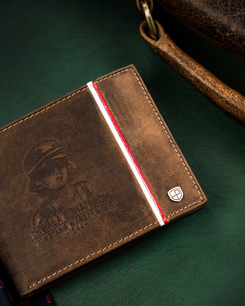 - Patriotyczny dodatek | Portfel o klasycznej stylistyce. Model w orientacji poziomej bez zapięcia zewnętrznego. Na froncie mieści się tłoczony motyw upamiętniający Powstanie Warszawskie;