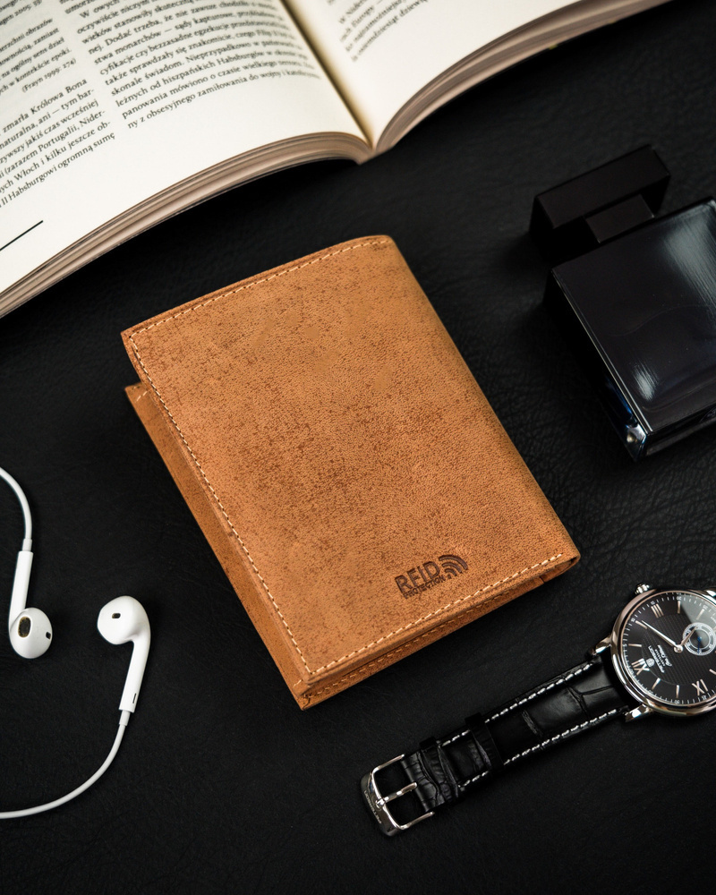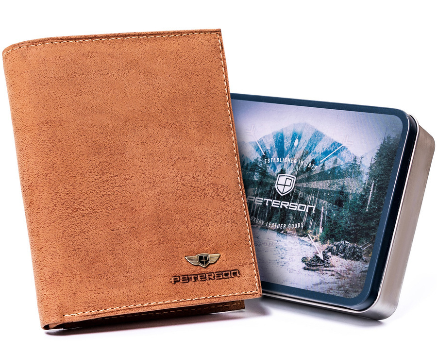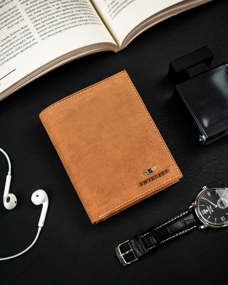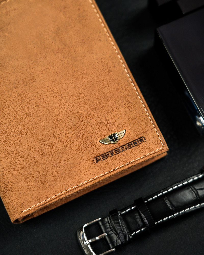 Portfel wykonany jest ze starannie wyselekcjonowanej skóry naturalnej nubukowej, garbowanej niezmienną od dziesięcioleci techniką.