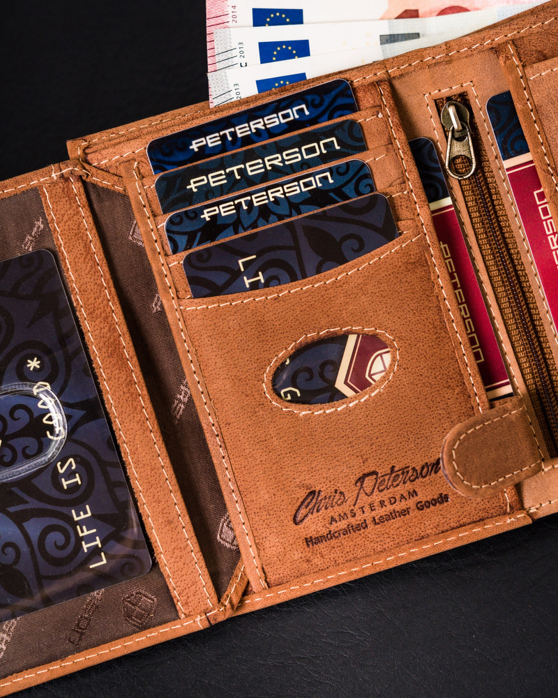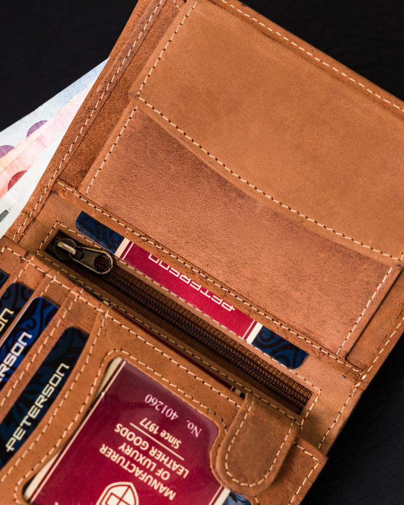 - banknoty schowasz do 2 otwartych, szerokich przegródek, wykończonych materiałową podszewką.
