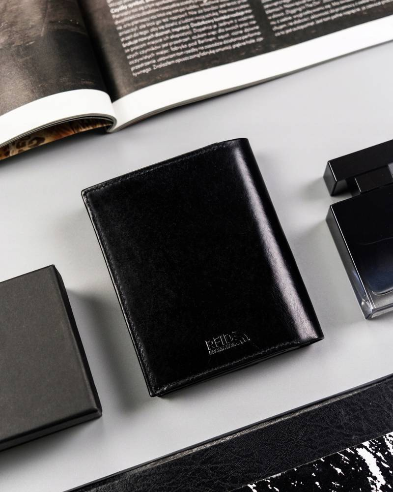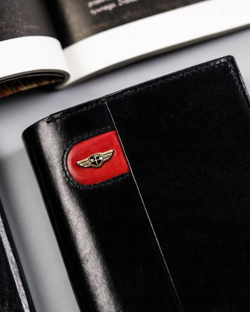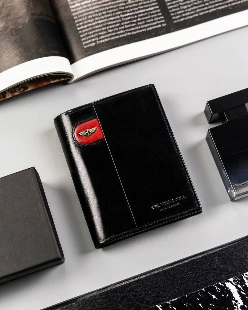 - Ergonomiczny design | Odszyty bardzo trwale z doskonałej jakości gładkiej skóry naturalnej w czarnym kolorze, dodatkowo na froncie portfela wyszyto trójkolorowy paseczek;