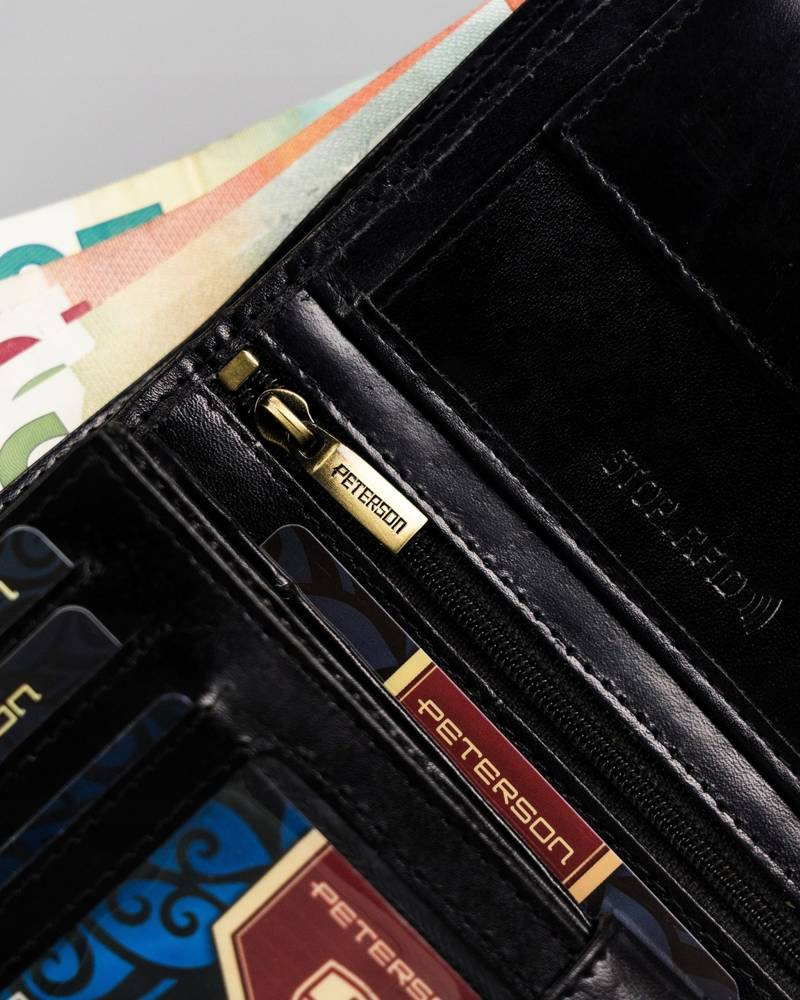 - banknoty schowasz do 2 otwartych przegródek wyszytych po całej szerokości portfela.