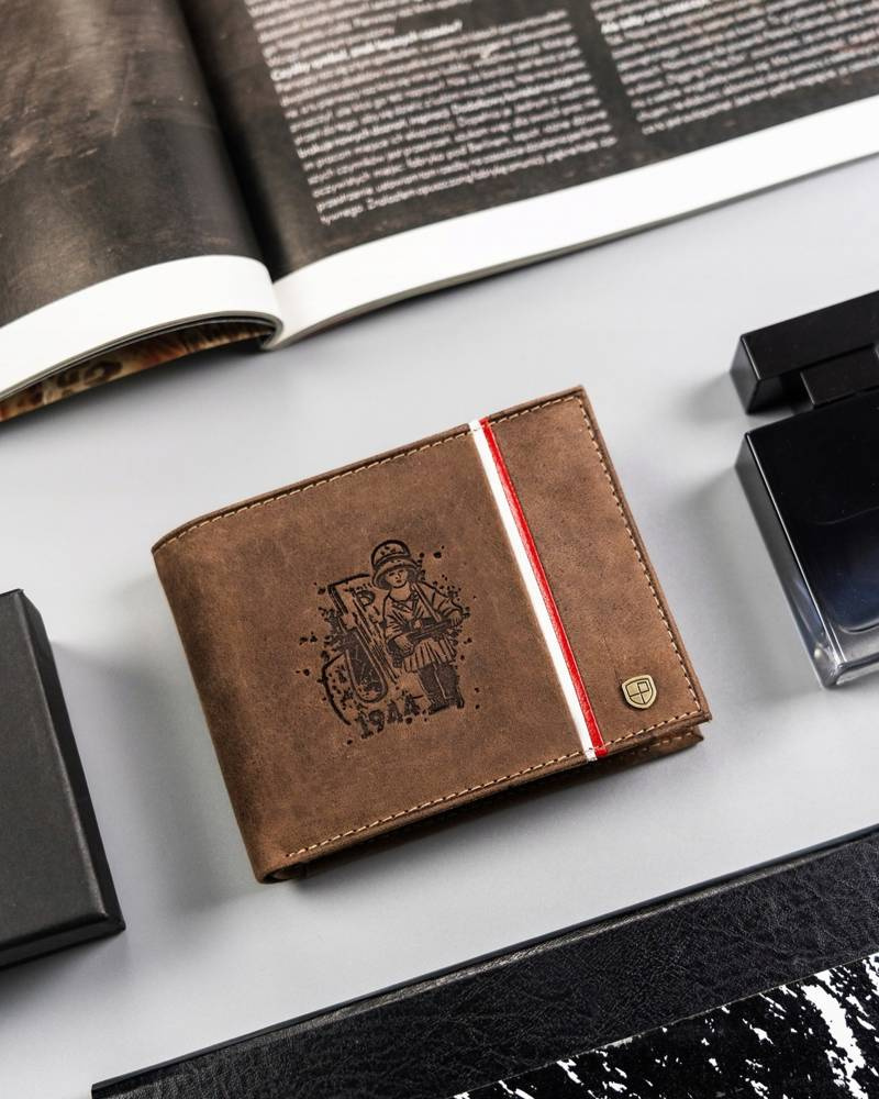 • Portfel dla Patrioty | Portfel o klasycznej stylistyce. Model w orientacji poziomej bez zapięcia zewnętrznego. Na froncie mieści się tłoczony wzór upamiętniający Powstanie Warszawskie;
