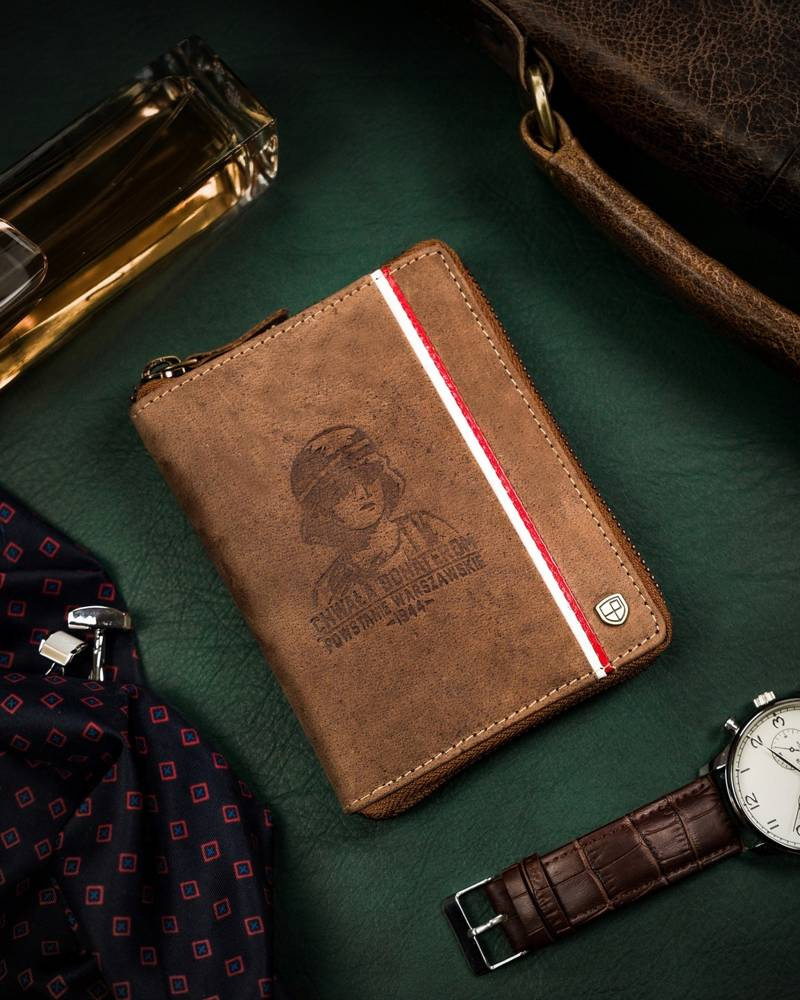 - Patriotyczny design | Portfel o klasycznej stylistyce. Model w orientacji pionowej zapinany w całości na zamek. Na froncie mieści się piękny, tłoczony wzór upamiętniający Powstanie Warszawskie;