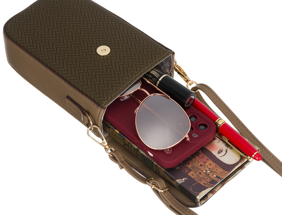 Na rewersie torebki umieszczono niewielką kieszeń zamykaną na zatrzask. Wewnątrz niej znajduje się 6 miejsc na karty, których używasz najczęściej i chcesz mieć zawsze pod ręką. Główna komora, zamykana klapką na zatrzask, została wyściełana na jasnej podszewce. Pozwala to uniknąć otarć na eko skórze, podczas wkładania i wyjmowania przedmiotów.