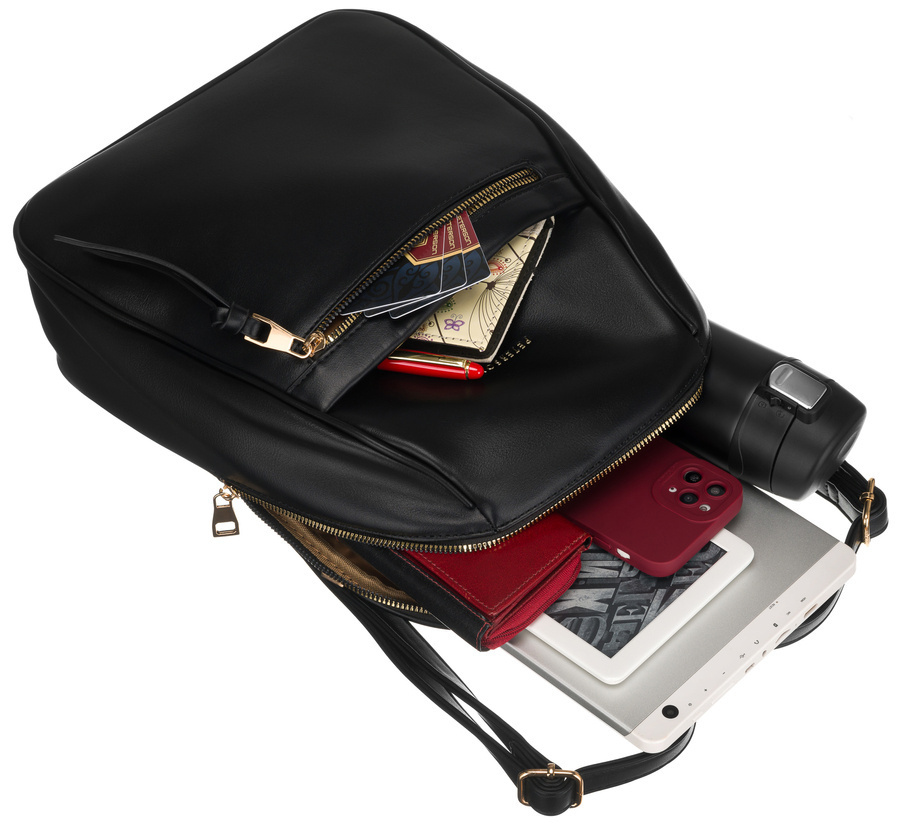 Prezentowany model wykonany został bardzo trwale z wysokiej klasy skóry ekologicznej. Zawieszony na regulowanych szelkach z eko skóry. Posiada uchwyt na dłoń, który będzie przydatny np. w komunikacji miejskiej. Wszystkie jego metalowe elementy mają złoty kolor, który świetnie kontrastuje z barwą eko skóry.