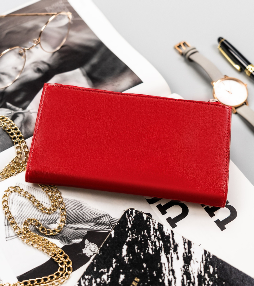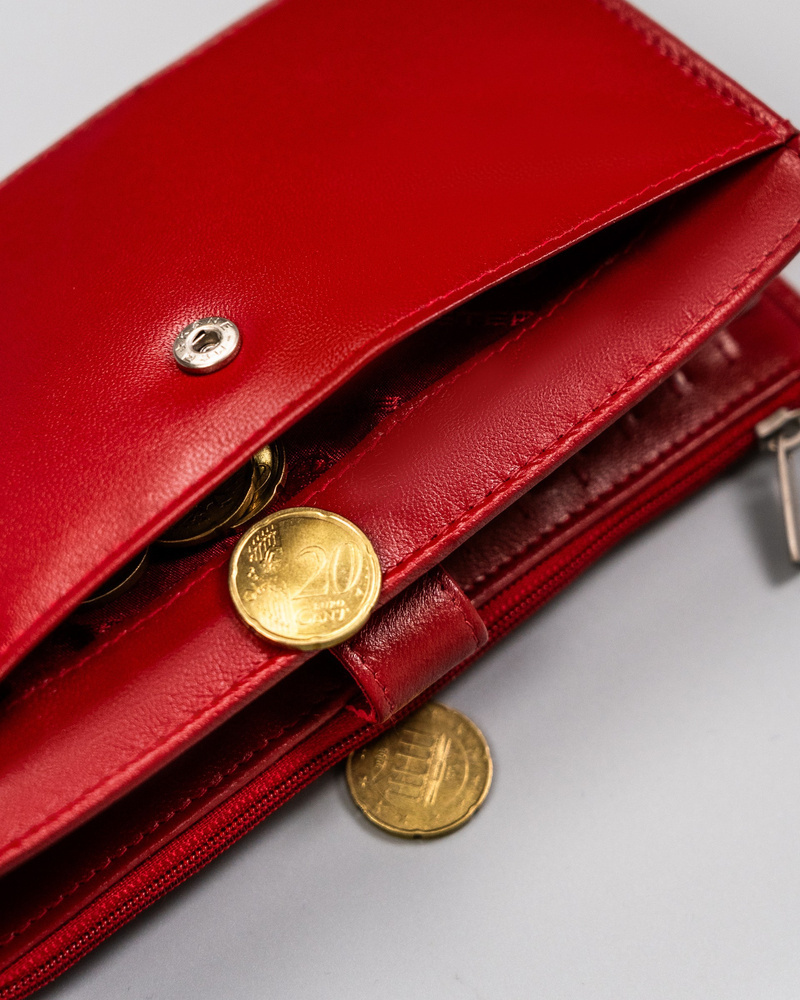 Po zewnętrznej stronie portfela wyszyto pojemną kieszeń na suwak, w której przechowasz bilon.