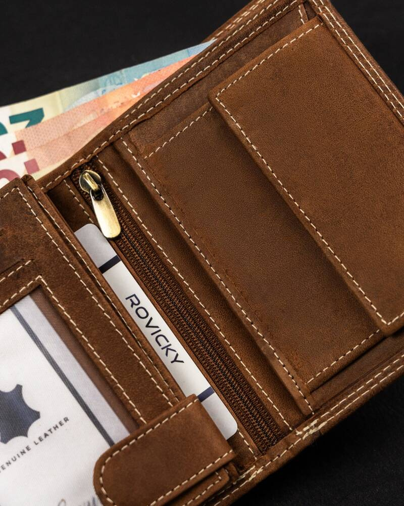 Środek portfela został zaprojektowany tak, abyś mógł zmieścić wszystkie karty, dokumenty i pieniądze, które na co dzień potrzebujesz. Dodatkowo wnętrze obszyto podszewką, która chronić będzie skórę przed uszkodzeniami.