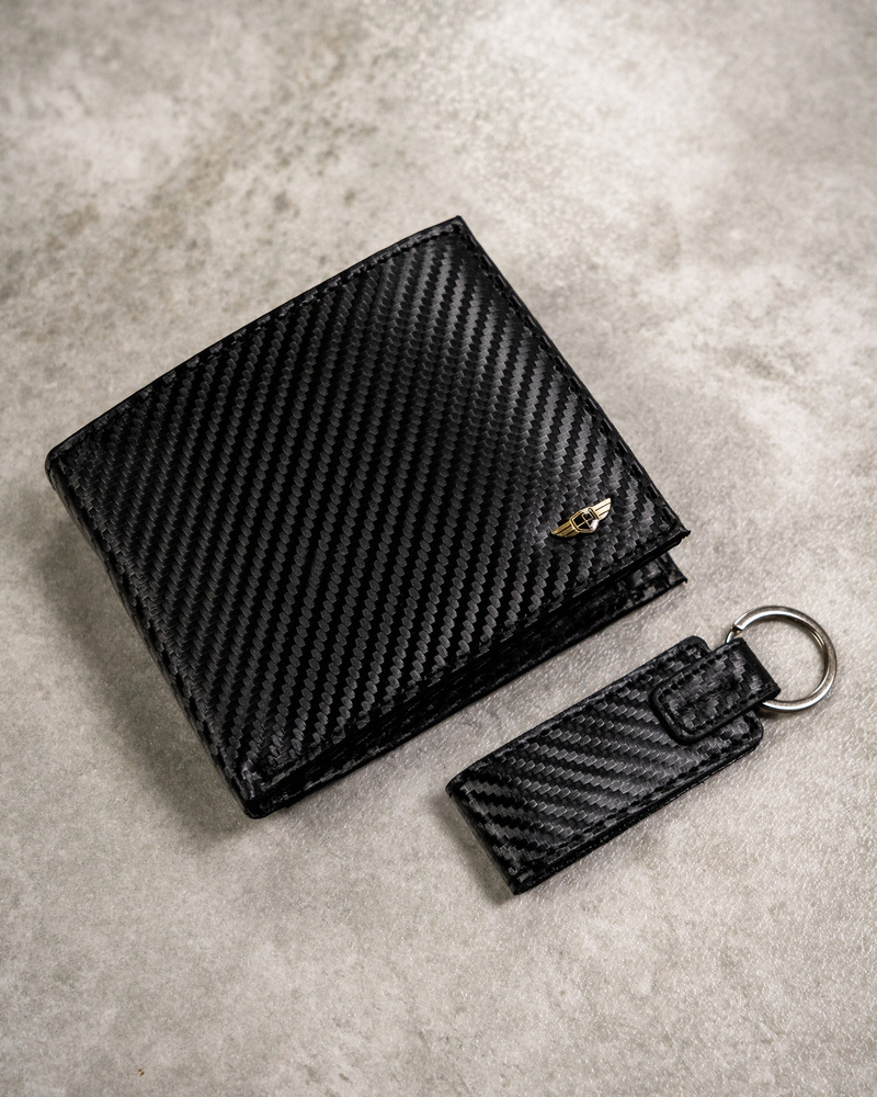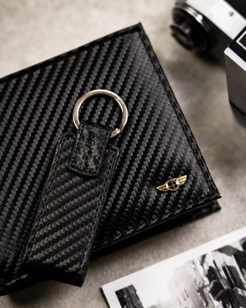 - W komplecie ze stylowym breloczkiem | Brelok ozdobni Twoje klucze. Podobnie jak portfel stylizowany jest na włókno węglowe