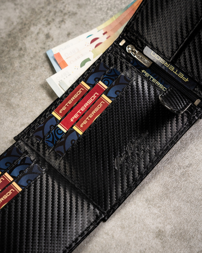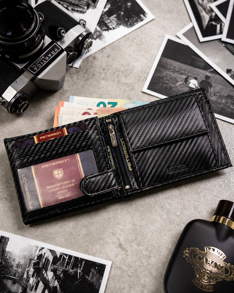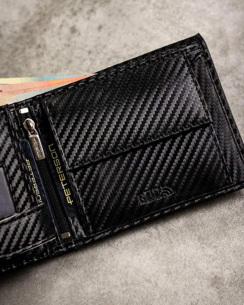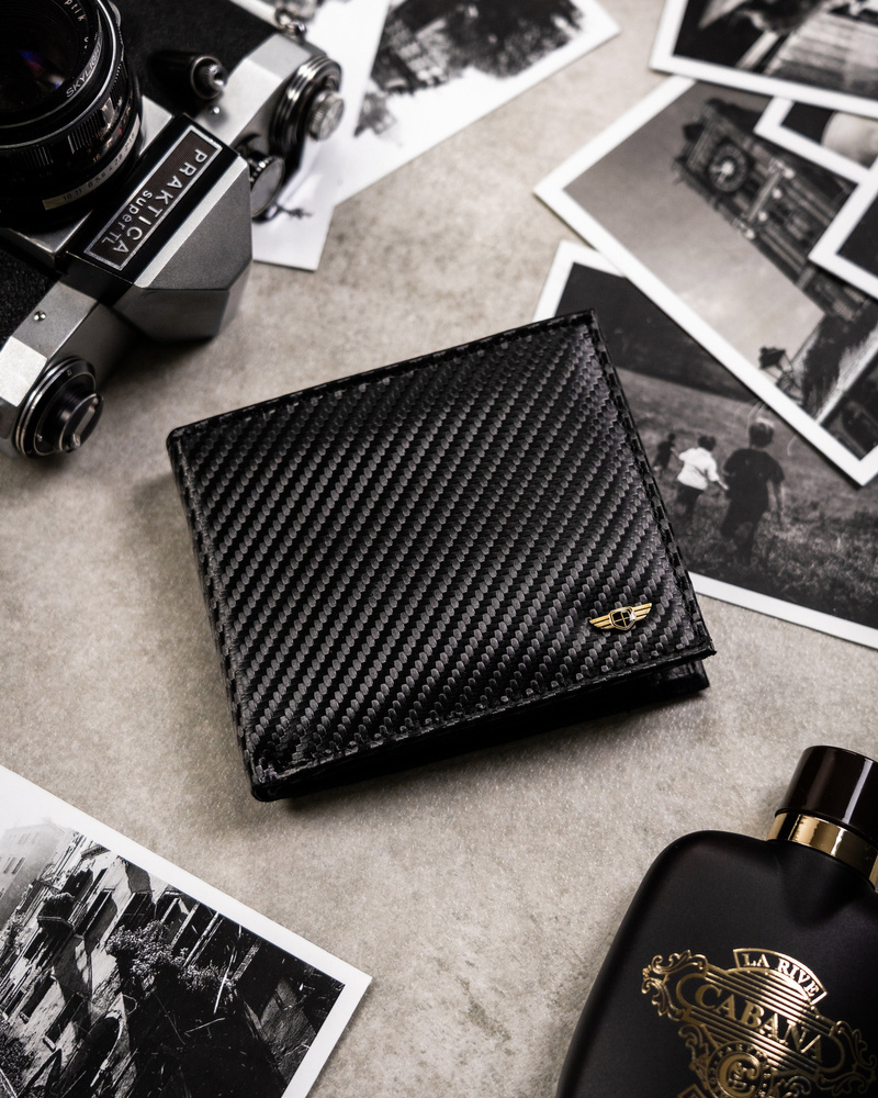 - Najwyższa jakość wykonania | Portfel wykonany został z wysokiej jakości skóry naturalnej powleczonej z zewnątrz warstwą do słudzenia przypominającą włókno węglowe (carbon)