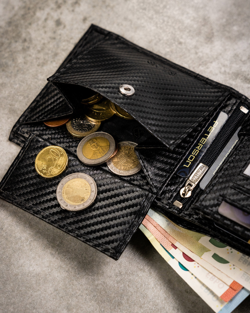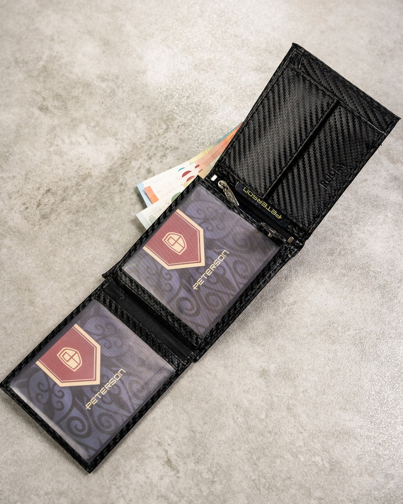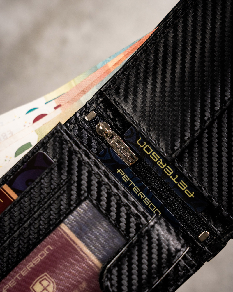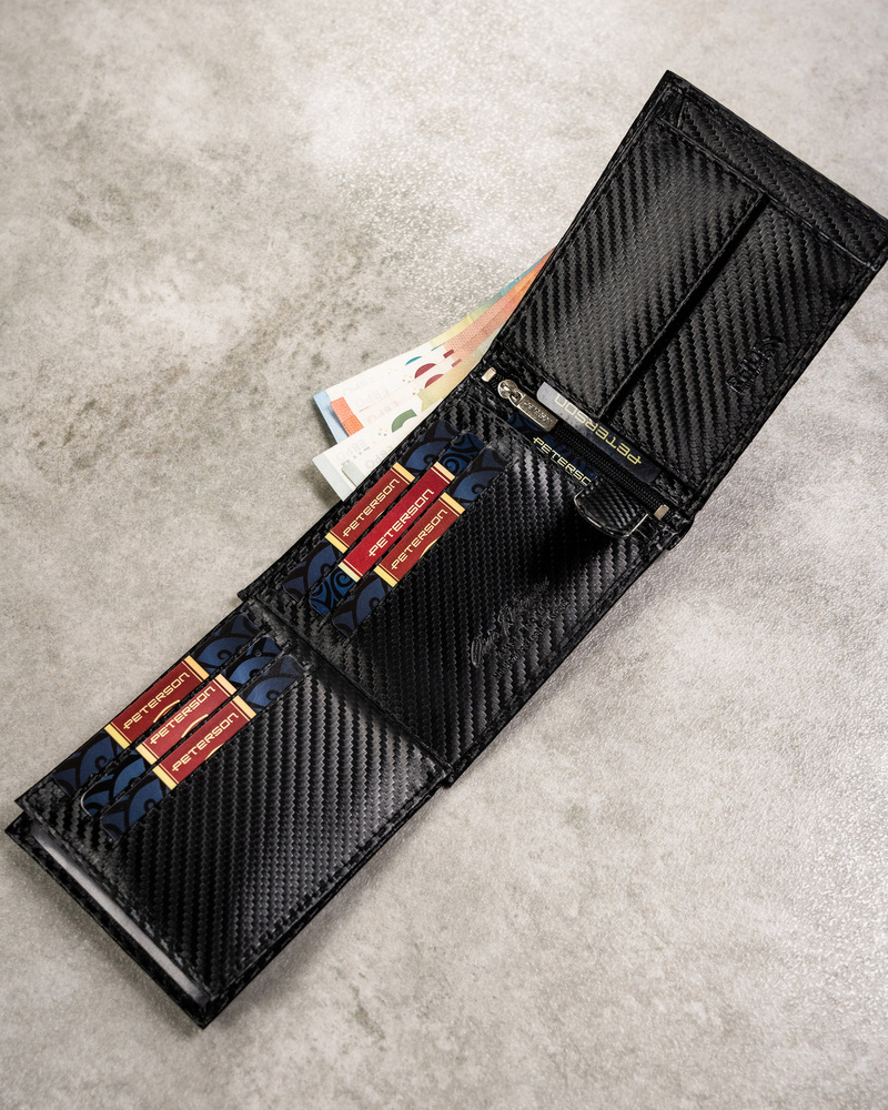 - Najwyższa jakość wykonania | Portfel wykonany został z wysokiej jakości skóry naturalnej powleczonej z zewnątrz warstwą do słudzenia przypominającą włókno węglowe (carbon)