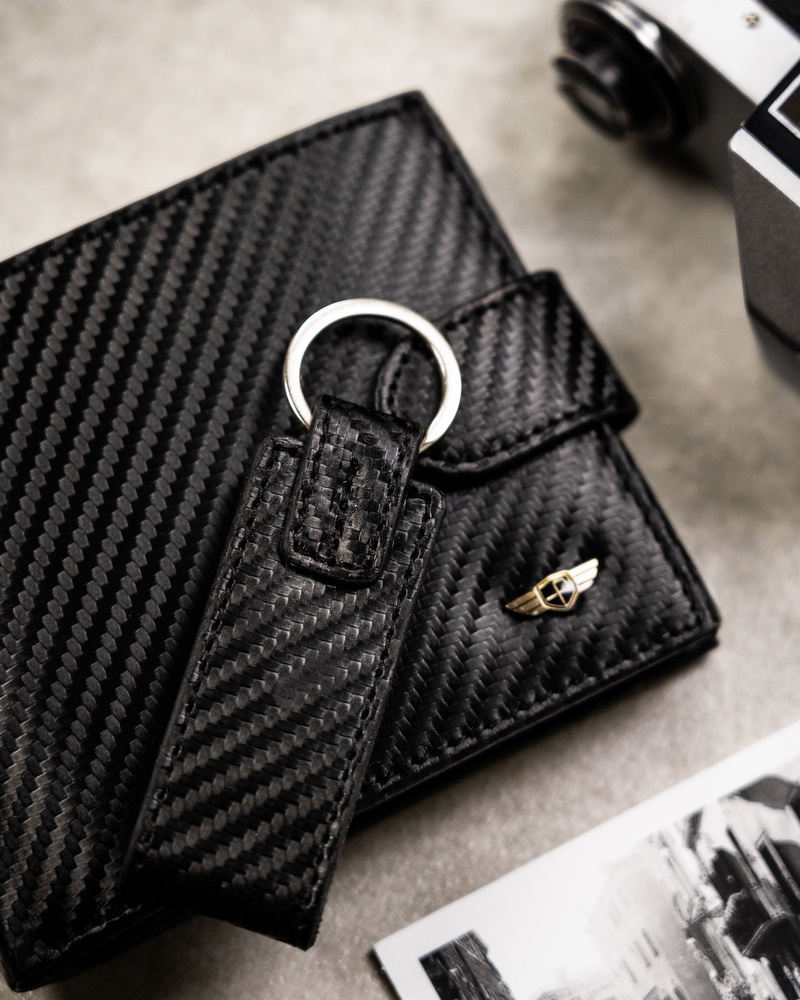 - W komplecie ze stylowym breloczkiem | Brelok ozdobni Twoje klucze. Podobnie jak portfel stylizowany jest na włókno węglowe