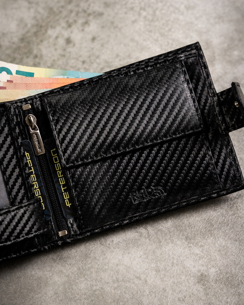 - Najwyższa jakość i precyzja wykonania | Portfel wykonany został z wysokiej jakości skóry naturalnej powleczonej z zewnątrz warstwą do złudzenia przypominającą włókno węglowe (carbon)Model z zewnętrznym zapięciem w postaci zatrzasku.
