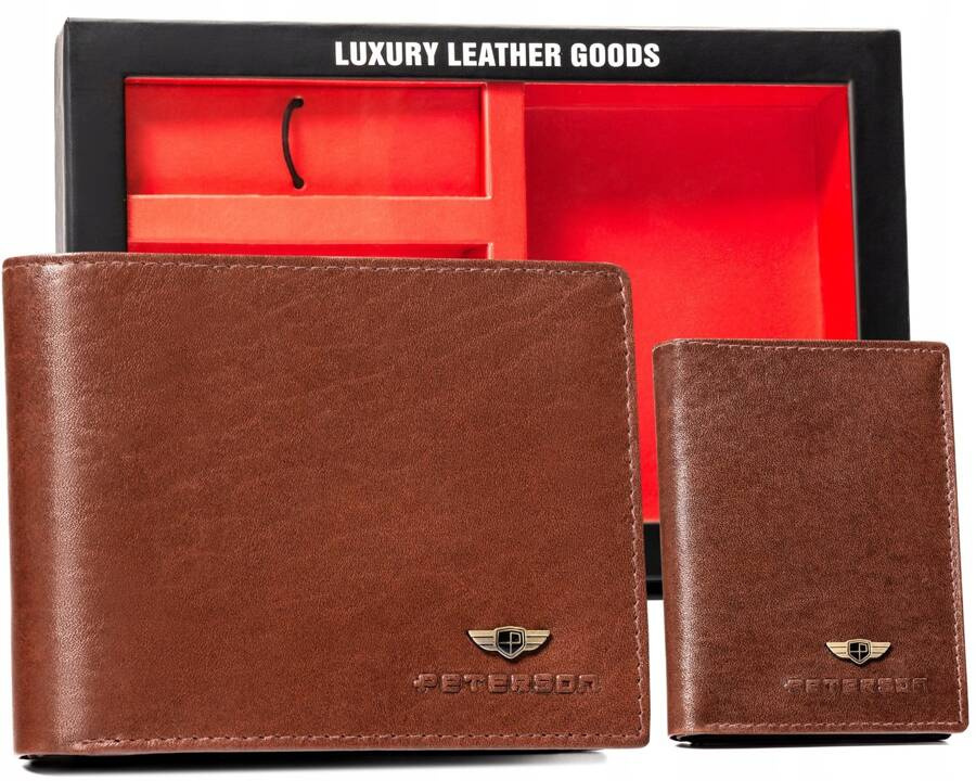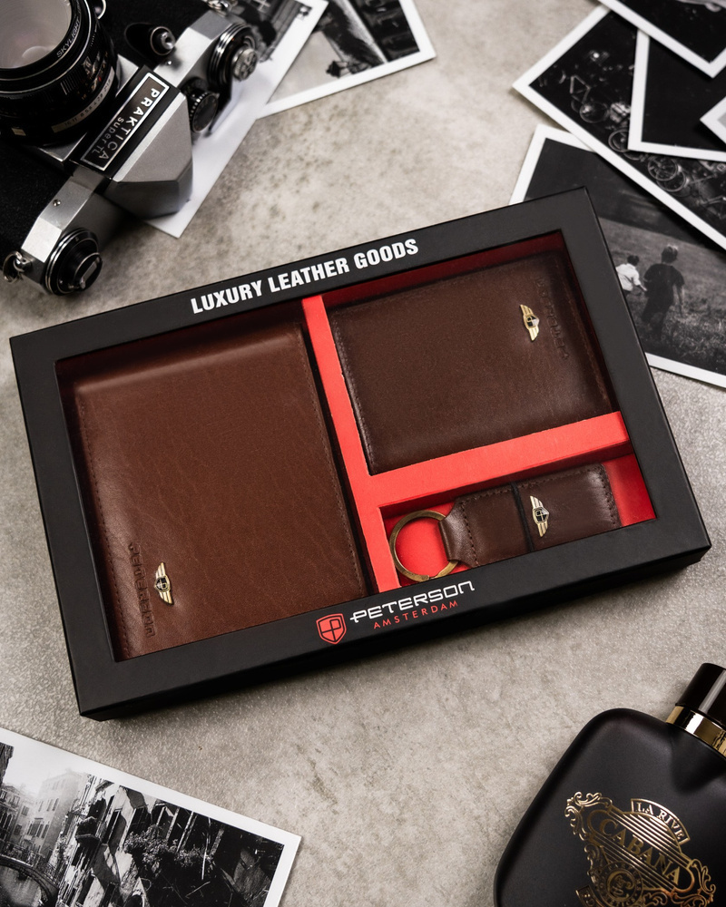 Zestaw prezentowy: elegancki skórzany portfel, etui na karty i brelok Peterson